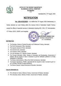 اس حوالے سے ڈپٹی کمشنر اسلام آباد کی طرف سے نوٹی فیکیشن بھی جاری کردیا گیا ہے۔