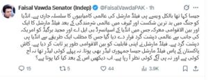سوشل میڈیا سائٹ ایکس (سابق ٹویٹر) پر کی گئی ٹویٹ میں ان کا کہنا تھا کہ “جیسا کہا تھا بالکل ویسے ہی فیلڈ مارشل کی عالمی کامیابیوں کا سلسلہ جاری ہے۔ انڈیا کو جنگ میں بد ترین شکست اور ٹیرف میں عالمی شرمندگی کے بعد فیلڈ مارشل کا ایک اور بین الاقوامی معرکہ جس میں انڈیا کے اسپانسرڈ بی ایل اے اور مجید برگیڈ کو امریکا کی جانب سے عالمی دہشت گرد قرار دے دیا گیا جس کا مطلب ایک طریقے سے انڈیا ہی دہشت گرد ہے۔