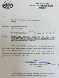 رپورٹ کے مطابق فلم جوائے لینڈ کی نمائش کرنے پر ڈی سی لاہور کی جانب سے ڈی آئی جی آپریشنز کو کاروائی کا مراسلہ جاری کردیا گیا یادرہے پابندی کا شکار فلم جوائے لینڈ کی غیر قانونی نمائش سترہ اگست آج سے ہونی تھی ۔