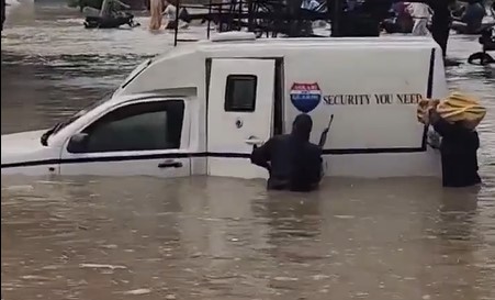 Share Facebook Twitter Email WhatsApp کراچی میں سیلابی پانے میں گھرے بنک گارڈز رقم سے بھرے تھیلے محفوظ جگہ منتقل کررہے ہیں https://benaqabtv.com/wp-content/uploads/2025/08/tweeload_qrp7xghv.mp4
