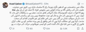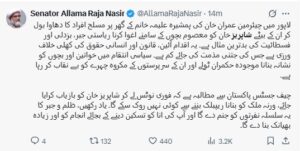 اسد قیصر نے ایکس پر پوسٹ میں کہا ہے کہ ملک میں بدقسمتی سے اندھیر نگری چوپٹ راج کا سلسلہ جاری ہے، لاہور میں محترمہ علیمہ خان کی رہائش گاہ پر سادہ کپڑوں میں ملبوس افراد کا حملہ اور ان کے بیٹے شاہ ریز کا اغوا نہ صرف افسوسناک بلکہ انتہائی قابلِ مذمت عمل ہے۔ یہ واقعات اس بات کا ثبوت ہیں کہ شہریوں کی جان و مال اور عزت محفوظ نہیں رہی
