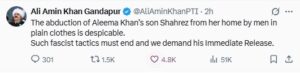 علی امین گنڈا پور نے اپنی ٹویٹ میں کہا ہے کہ علیمہ خان کے بیٹے شاہ ریز کو ان کے گھر سے سادہ لباس میں ملبوس افراد کے ذریعے اغوا کرنا قابلِ مذمت ہے۔ ایسے فاشسٹ ہتھکنڈوں کا خاتمہ ہونا چاہیے اور ہم ان کی فوری رہائی کا مطالبہ کرتے ہیں