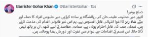 گوہر خان نے سوشل میڈیا ایکس پر اپنی ٹویٹ میں کہا ہے کہ لاہور میں محترمہ علیمہ خان کی رہائشگاہ پر سادہ کپڑوں میں ملبوس افراد کا حملہ اور بیٹے شاہ ریز کا اغوا انتہائی قابلِ افسوس ہے۔ ہم اس غیر قانونی اقدام کی مذمت کرتے ہیں۔ فیملی سب کی قابلِ احترام ہوتی ہے، سیاسی مقاصد کے لیے کبھی ان پر ہاتھ نہیں ڈالا جاتا۔ اس قسم کے اقدامات سے عوام میں نفرت اور دوریاں پیدا ہوجاتی ہیں۔