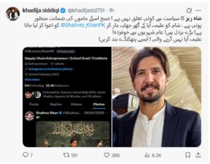 پی ٹی آئی رہنما خدیجہ صدیقی کا کہنا ہے کہ شاہ ریز کا سیاست سے کوئی تعلق نہیں ہے ! صبح اسکے ماموں کی ضمانت منظور ہوتی ہے ، شام کو علیمہ آپا کے گھر چھاپہ مار کر شاہ ریز کو اغوا کر لیا جاتا ہے! بڑے بزدل ہیں!