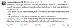رپورٹ کے مطابق جمائمہ گولڈ اسمتھ نے سوشل میڈیا سائٹ ایکس (سابق ٹوئٹر) پر اپنی ایک پوسٹ میں کہا ہے کہ گذشتہ دنوں میں میرے بیٹوں کے کزن شہریز اور شیرشاہ (علیمہ خان کے بیٹے) کو ان کے چھوٹے بچوں کے سامنے ان کے گھروں سے اغوا کر کے جیل میں بند کر دیا گیا ہے۔
