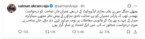 سوشل میڈیا سائٹ ایکس (سابق ٹوئٹر ) پر پوسٹ کی گئی ٹویٹ میں سلمان اکرم راجا کا کہنا تھا کہ پچھلے منگل میں نے علی بخاری ایڈووکیٹ کے ذریعے عمران خان صاحب کو درخواست بھیجی تھی کہ پارٹی ممبران کو بے تحاشہ ناحق سزاؤں کے پیش نظر مجھے سیکریٹری جنرل کے عہدے سے ہٹ کر قانونی معاملات پر توجہ مرکوز کرنے دی جائے۔