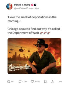 واشنگٹن:امریکی صدر ڈونلڈ ٹرمپ نے ” ٹروتھ سوشل “ پر ایک تصویر شائع کی جس میں وہ فوجی وردی میں نظر آ رہے ہیں اور ان کے پیچھے جنگی طیارے شکاگو پر بمباری کر رہے ہیں۔ انہوں نے تبصرہ کرتے ہوئے لکھا کہ شکاگو کو جلد ہی وزارتِ جنگ کے نام کی وجہ معلوم ہو جائے گی۔