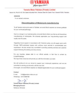 منگل کو یاماہا موٹر پاکستان کی جانب سے جاری ہونے والے باضابطہ بیان میں کمپنی نے کہا ہے کہ ہماری بزنس پالیسی میں تبدیلی کی وجہ سے ہم آپ کو آگاہ کرنا چاہے گے کہ ہم موٹرسائیکلوں کی مینوفیکچرنگ بند کر رہے ہیں۔ہم آپ کے اتنے برسوں کی حمایت اور ہم سے جڑے رہنے پر تہہ دل سے شکریہ ادا کرتے ہیں۔