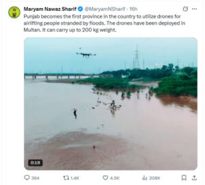 Share Facebook Twitter Email WhatsApp وزیراعلی پنجاب مریم نواز شریف نے اپنے ایک ٹویٹ میں کہا ہے کہ پنجاب سیلاب میں پھنسے ہوئے لوگوں کو ایئر لفٹنگ کے لیے ڈرون استعمال کرنے والا ملک کا پہلا صوبہ بن گیا ہے۔ ڈرونز کو ملتان میں تعینات کر دیا گیا ہے۔ یہ 200 کلو گرام تک وزن اٹھا سکتا ہے۔ https://benaqabtv.com/wp-content/uploads/2025/09/tweeload_uuroohi9.mp4
