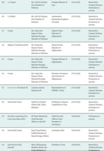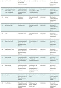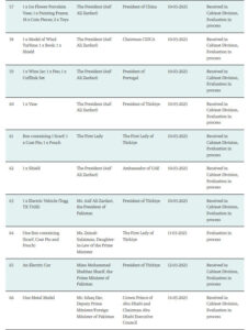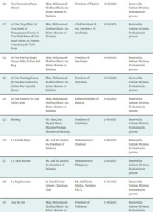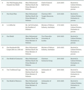 2025 کی پہلی ششماہی کے دوران موصول ہونے والے تحائف میں ڈیکوریشن پیس، گھڑیاں، الیکٹرک گاڑیاں، قالین، بستر کی چادریں، نماز کے لئے مصلہ، میز پوش، کافی اور چائے کے سیٹ اور ٹائی شامل تھے۔ تمام اشیاء توشہ خانہ میں جمع کرادی گئیں۔ کابینہ ڈویژن نے کہا کہ جمع کیے گئے تحائف کی تشخیص کا عمل جاری ہے۔ یادرہے وزیراعظم شہباز شریف کی قیادت میں حکومت 2002 سے 31 دسمبر 2024 تک کا توشہ خانہ کا ریکارڈ پہلے ہی منظر عام پر لا چکی ہے جبکہ اس سے قبل 1997 سے 2001 تک کا ریکارڈ بھی جاری کیا جا چکا ہے۔