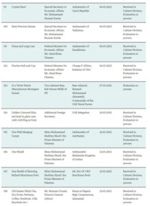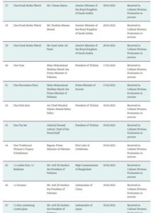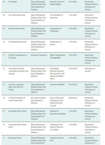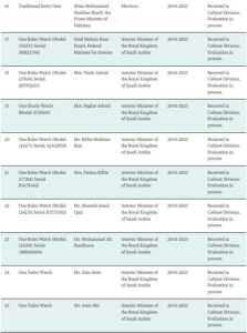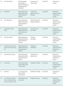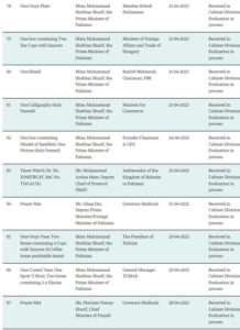 وفاقی وزیر داخلہ محسن نقوی، وزیر اقتصادی امور احد چیمہ، چیف آف جنرل سٹاف لیفٹیننٹ جنرل سید عامر رضا، وائس ایڈمرل راجہ رب نواز، چیئرمین نیب لیفٹیننٹ جنرل (ر) نذیر احمد، وزیر تجارت اور سیکرٹری تجارت نے بھی تحائف وصول کئے۔ فہرست میں ملک احمد خان اسپیکر پنجاب اسمبلی ، محمد علی رندھاوا، رفعت مختار راجہ، وہاب ریاض، زین عاصم اور عثمان باجوہ بھی شامل ہیں، سابق سفارت کار طارق فاطمی، صوبائی وزیر خواجہ عمران نذیر اور دیگر شخصیات کے نام بھی وصول کرنے والوں میں شامل ہیں۔ زیادہ تر تحائف اعلیٰ غیر ملکی حکومتی عہدیداروں اور معززین نے پیش کئے۔