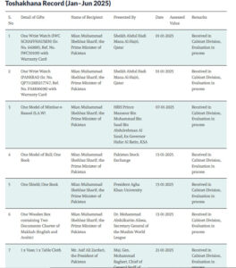 “ پرو پاکستانی “ کی رپورٹ کے مطابق کیبنٹ ڈویژن نے یکم جنوری سے 30 جون 2025 تک کا توشہ خانہ کا ریکارڈ جاری کیا ہے جس سے ظاہر ہوتا ہے کہ چھ ماہ کے دوران اعلیٰ سیاسی رہنماؤں، فوجی سربراہوں اور اعلیٰ حکام کو تحائف موصول ہوئے۔