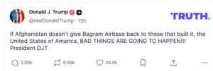 ٹرمپ نے اپنے سوشل میڈیا نیٹ ورک ٹروتھ سوشل پر جاری ایک پیغام میں لکھا ہے کہ ’اگر افغانستان نے بگرام ایئر بیس کو اسے تعمیر کرنے والوں یعنی امریکہ کو واپس نہیں کیا تو برا ہو گا!!!‘