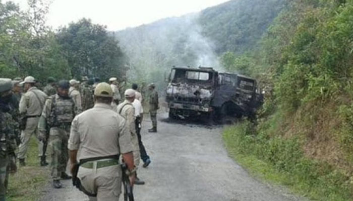 بھارتی میڈیا رپورٹس کے مطابق منی پور میں نمبول کے قریب نامعلوم مسلح افراد نے 33 آسام رائفلز کے قافلے پر بڑا حملہ کیا ہے۔بھارتی میڈیا نے مسلح افراد کی فائرنگ سے آسام رائفلز کے بیشتر اہلکاروں کی ہلاکت اور کئی کے زخمی ہونے کی تصدیق کی ہے۔رپورٹس میں کہا گیا ہے کہ گھات لگائے مسلح افراد نے ہائی وے پر آسام رائفلز کے قافلے پر اچانک حملہ کیا۔33 آسام رائفلز کا دستہ پٹسوئی کمپنی آپریٹنگ بیس سے نمبول کمپنی آپریٹنگ بیس کی طرف جارہا تھا۔