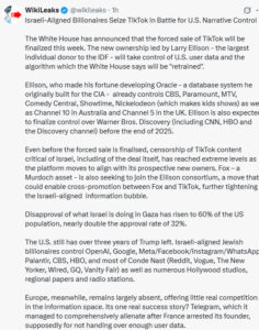 وکی لیکس کے مطابق وائٹ ہاؤس نے اعلان کیا ہے کہ TikTok کی جبری فروخت کو اس ہفتے حتمی شکل دی جائے گی۔ ٹک ٹاک کا نیا مالک لیری ایلیسن ہوگا جو کہ اسرائیلی فوج IDF کو سب سے زیادہ عطیہ دینے والا انفرادی عطیہ دہندہ ہے – لیری ایلیسن امریکی صارفین کے ڈیٹا اور الگورتھم کا کنٹرول سنبھالے گا۔