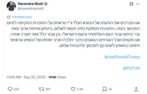 عبرانی زبان میں کی گئی ایکس پر شائع شدہ بھارتی وزیراعظم مودی کی ٹویٹ میں کہا گیا ہے کہ“ہم صدر ڈونلڈ جے ٹرمپ کے غزہ میں تنازعہ کے خاتمے کے لیے جامع منصوبے کے اعلان کا خیرمقدم کرتے ہیں۔“