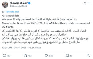 وفاقی وزیردفاع خواجہ آصف نے سماجی رابطے کی سائٹ ایکس پر خوشخبری کا اعلان کرتے ہوئے کہا ہے کہ “ انشا ء اللہ پی آئ اے کی ھفتہ میں مانچسٹر کے لئے دو فلائٹوں کا آغاز 25اکتوبر کو اسلام آباد سےھو رہا ھے۔ پی ٹی آئ کی حکومت میں پی آئی اےپہ جو پابندی لگی PIA اور سول ایوی ایشن کی دن رات محنت سے یہ مشکل اور کٹھن سال اللہ کے فضل سے اختتام پہ پہنچ رہے ھیں۔ قوم کو مبارک ھو۔ الحمد للہ “۔