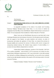 علی امین گنڈا پور نے اپنا استعفیٰ گورنر خیبرپختونخوا کو بھیج دیا ہے۔