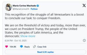 ماچاڈو نے انسٹاگرام پر لکھا کہ وینزویلا کے لوگوں کی جدوجہد کا یہ اعتراف ان کے کام کو مکمل کرنے کے لیے ایک تحریک ہے۔ ماچاڈو نے پوسٹ میں کہا، "ہم فتح کے دہانے پر ہیں اور آج، پہلے سے کہیں زیادہ، ہم آزادی اور جمہوریت کے حصول میں اپنے اہم اتحادیوں کے طور پر صدر ٹرمپ، ریاستہائے متحدہ کے عوام، لاطینی امریکہ کے لوگوں اور دنیا کی جمہوری اقوام پر بھروسہ کرتے ہیں۔”