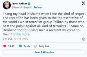 جاوید اختر نے طالبان کو "بدترین دہشت گرد گروپ” قرار دیا اور ہندوستان جیسے ملک میں اس کے نمائندے کے پرتپاک استقبال پر مایوسی کا اظہار کیا۔ اختر نے ایکس پر لکھا، "میرا سر شرم سے جھک جاتا ہے جب میں دیکھتا ہوں کہ دنیا کے بدترین دہشت گرد گروپ طالبان کے نمائندے کو منبر والوں کی طرف سے جس طرح کا احترام اور استقبال کیا گیا ہے۔” انہوں نے متقی کے اتر پردیش کے سہارنپور ضلع میں دارالعلوم دیوبند کی طرف سے پرتپاک استقبال پر تنقید کرتے ہوئے یاد دلایا کہ یہ ان لوگوں میں سے ایک ہے جنہوں نے لڑکیوں کی تعلیم پر مکمل پابندی عائد کر رکھی ہے۔ میرے ہندوستانی بھائیو اور بہنو!!! ہمارے ساتھ کیا ہو رہا ہے،”