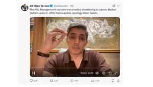 ملتان سلطانز نے جمعرات کو اپنے ایکس اکاؤنٹ پر جاری بیان میں بتایا تھا کہ پاکستان کرکٹ بورڈ نے گذشتہ ماہ فرنچائز کو لیگل نوٹس بھیجا، جس میں مطالبہ کیا گیا کہ وہ اپنے حالیہ بیانات واپس لیں اور پی ایس ایل انتظامیہ سے عوامی معافی مانگیں۔