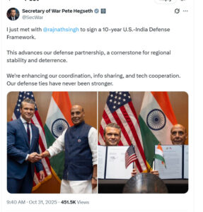 امریکی وزیر دفاع پیٹر ہیگ سیتھ نے ایک سوشل میڈیا پوسٹ میں اس پیشرفت کا اعلان کرتے ہوئے کہا کہ دونوں ممالک کے "دفاعی تعلقات پہلے کبھی اتنے مضبوط نہیں رہے۔” ہیگستھ نے ایکس پر ایک پوسٹ میں کہاکہ "میں نے ابھی راج ناتھ سنگھ سے 10 سالہ یو ایس انڈیا ڈیفنس فریم ورک پر دستخط کرنے کے لیے ملاقات کی ہے۔”