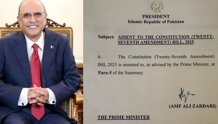 اسلام آباد :صدر آصف علی زرداری نے آج 27ویں آئینی ترمیم بِل پر دستخط کر دئیے ہیں، جو دونوں ایوانوں سے منظور ہو چکی ہے۔ اس ترمیم کے بعد، بل اب آئین کا حصہ بن گیا ہے۔