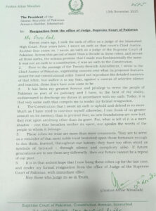 سپریم کورٹ کے جج جسٹس اطہر من اللّٰہ بھی مستعفی ہوگئے۔ جسٹس اطہر من اللّٰہ نے استعفیٰ صدرِ پاکستان کو بھجوادیا۔