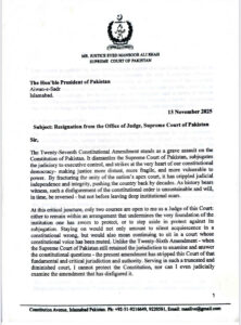 جسٹس منصور علی شاہ نے 27ویں آئینی ترمیم کو عدلیہ اور آئین پر سنگین حملہ قرار دیتے ہوئے سپریم کورٹ سے استعفیٰ دے دیا۔ ان کا کہنا ہے کہ اس ترمیم نے عدلیہ کو ایگزیکٹو کے ماتحت کر دیا اور سپریم کورٹ کی خودمختاری چھین لی۔