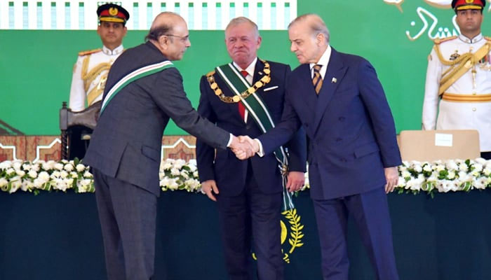 اتوار کے روز ایوان صدر میں اردن کے شاہ عبداللہ دوم کو پاکستان کا اعلیٰ ترین سول ایوارڈ دینے کے لیے پروقار تقریب کا انعقاد کیا گیا، تقریب میں صدر مملکت آصف علی زرداری، وزیراعظم شہباز شریف، فیلڈ مارشل سید عاصم منیر، وفاقی وزرا اور دیگر سیاسی و عسکری قیادت نے شرکت کی۔