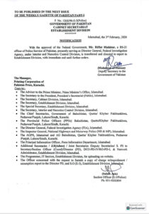 اسٹیبلشمنٹ ڈویژن نےمنسوخی کا نوٹیفکیشن رات گئےجاری کردیا تھا، رفعت مختار کو پہلے اسٹیبلشمنٹ ڈویژن رپورٹ کرنے کی ہدایت کی گئی۔