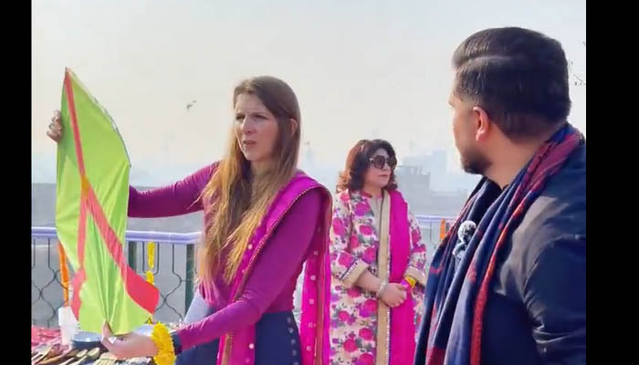 لاہور: بسنت فیور ۔۔۔ لاہورئیے تو خیر مجبور تھے ہی لیکن غیر ملکی سفارتکار بھی بسنت کے جادو سے نہ بچ سکے،برطانوی ہائی کمشنر جین میرئٹ اندرون شہر کی چھت پر نہ صرف گڈی اڑاتی رہیں بلکہ انہوں نے گڈی اڑانے کےحوالے سے جزئیات کی تفصیل بھی معلوم کیں اور خود تلاواں ڈالتی رہیں۔
