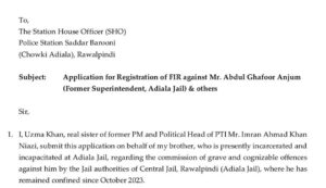 عمران خان کی جانب سے ان کی ہمشیرہ عظمیٰ خان نے تھانہ صدر بیرونی کی اڈیالہ پولیس چوکی پر مقدمہ درج کرنے کے لیے تحریری درخواست جمع کروا دی ہے۔