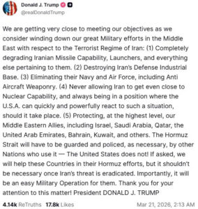 "امریکا اب پہرہ نہیں دے گا۔ اگر درخواست کی گئی تو ہم مدد کریں گے، لیکن ایران کے خطرے کے خاتمے کے بعد یہ ایک آسان فوجی آپریشن ہونا چاہیے جو باقی دنیا کو خود سنبھالنا ہوگا۔”