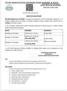 نئے اوقات کار کے تحت پہلی شفٹ کے اسکول صبح 8 بجے سے دوپہر ڈیڑھ بجے تک جاری رہیں گے، جبکہ سیکنڈ شفٹ کے اسکول دوپہر 1 بجے سے شام ساڑھے 5 بجے تک کھلے رہیں گے۔