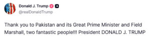 امریکی صدر ڈونلڈ ٹرمپ نے کہا ہے کہ آج دنیا کے لیے ایک عظیم دن ہے۔ انہوں نے امریکا اور ایران کے درمیان ثالثی میں مرکزی کردار ادا کرنے پر پاکستان کے وزیراعظم شہبازشریف اور فیلڈ مارشل سید عاصم منیر کو ’دو لاجواب شخصیات‘ کہہ کر مخاطب کیا اور دونوں کا شکریہ ادا کیا۔